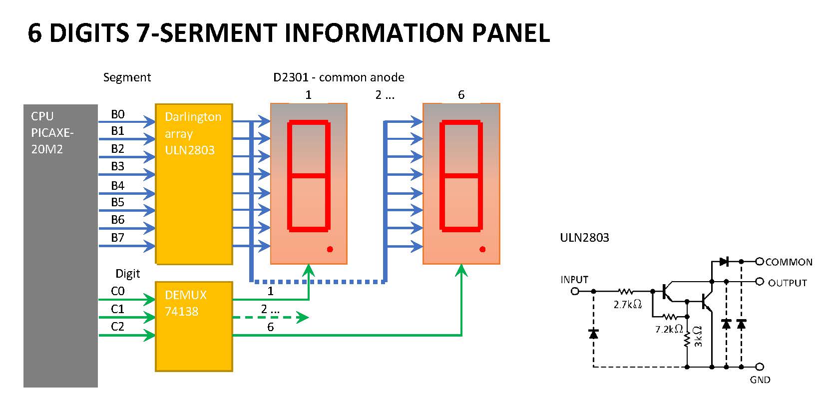 So, the most important part is the microcontroller. It has to ensure sufficient number of outputs for addressing of every one segment of every one digit separately. To be able to light up a random number of segments of everyone digit at the same time I will use eight outputs. One for every segment and one more for the dot. My idea is to scan the digits from left to right. In other words only one digit will be switched on in a certain moment. This allows me to use 3-to-8 Line Decoder and to save outputs this way. There will be three outputs for six digits addressing (see the block diagram below). I have decided to use PICAXE-20M2 microcontroller. It has twenty pins. This is useful, because I will need some more pins for connection to the real time clock via I2C, to the thermistor for eventual thermometer etc.