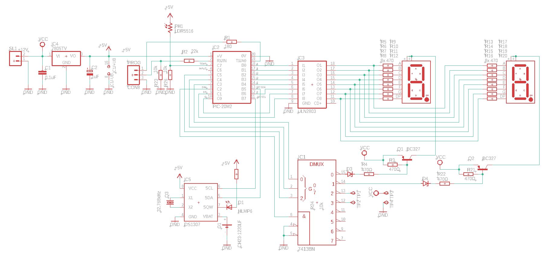 This weekend I have started the work on the electronic design of my clock. The scheme below is not finished.